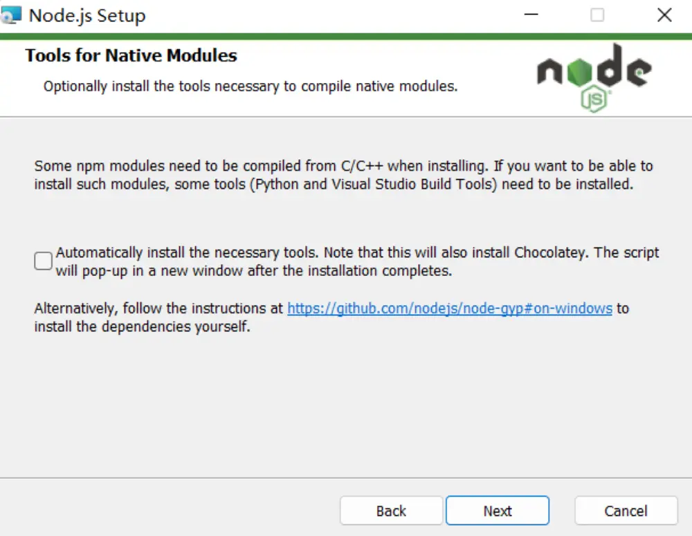 1.Download 官网: https://nodejs.org/ 建议下载 LTS (长期维护版) Windows 安装程序 (.msi) 2.Install 默认Next Tools for Native Modules不勾选 等待安装 检查是否安装成功 node -v npm -v