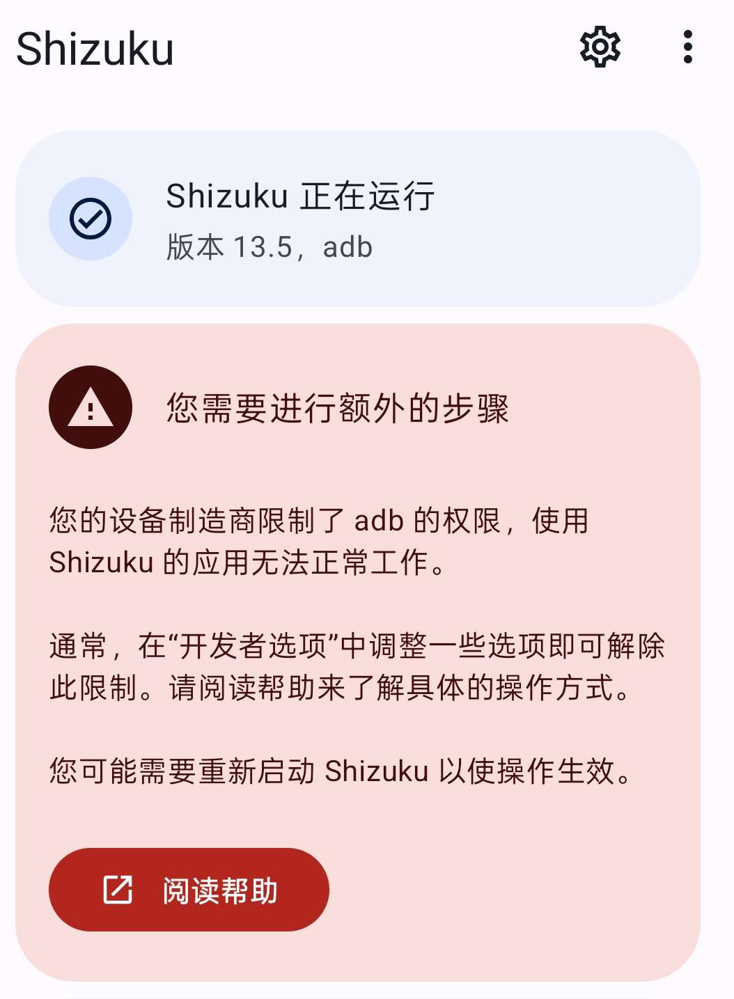 等等,暂停!正如上图所示,如果小伙伴们和我一样Shizuku出现了这样的警告,需要在“开发者模式”中关闭“权限监控”不同品牌和操作系统的设备解除限制的方法可以去看Shizuku的用户手册(包括一些详细教程):https://shizuku.rikka.app/zh-hans/guide/setup/#%E9%80%9A%E8%BF%87%E6%97%A0%E7%BA%BF%E8%B0%83%E8%AF%95%E5%90%AF%E5%8A%A8-%E9%80%9A%E8%BF%87%E8%BF%9E%E6%8E%A5%E7%94%B5%E8%84%91%E5%90%AF%E5%8A%A8-adb-%E6%9D%83%E9%99%90%E5%8F%97%E9%99%90