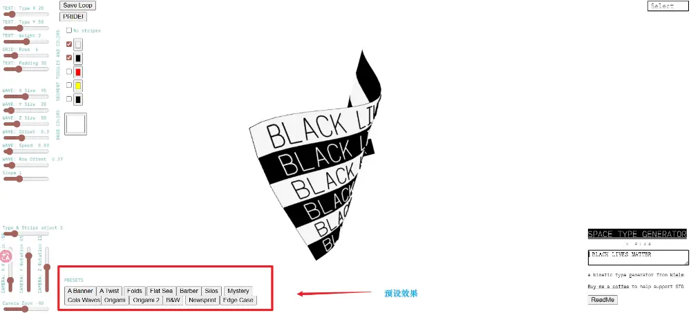 网页将界面的大致划分为参数区、预设效果区、项目选择区、文本输入区五个部分,并且根据每个效果不同的功能进行了相应的调整。